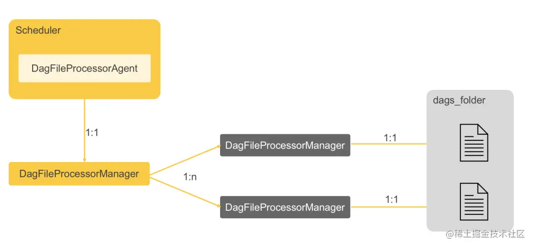 这之后就是面临的如何把Airflow中的任务平滑的迁移到 Apache DolphinScheduler 中,Airflow的任务都是一个个Python文件,Airflow 的调度器不停地扫描Pyhton文件所在文件目录,生成调度任务。核心实现类就是上图中的 DagFileProcessorManager,我们就可以参考这个类的实现来解析Python任务,生成Apache DolphinScheduler 任务定义需要的 Json 串,从而完成调度任务的迁移。