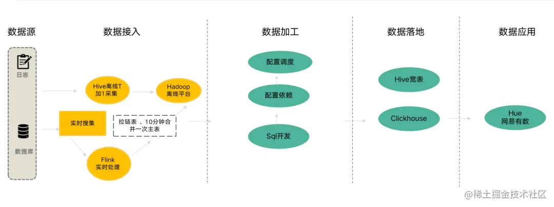 数据加工是分析师关心的部分,这个过程可以配置调度、配置依赖和 SQL 开发。而在数据落地上,我们采用了 ClickHouse 的 OLAP 引擎,数据应用层使用网易有数提供报表平台。