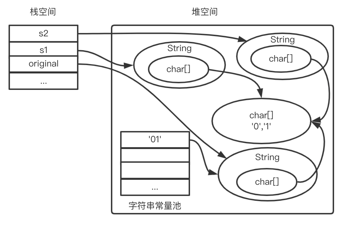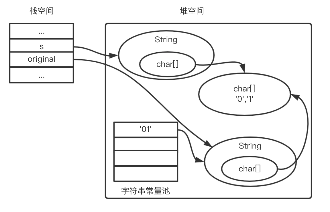 如果找不到就会在堆空间创建“01”的字符串对象和字符数组对象,把字符串对象引用赋值给original;