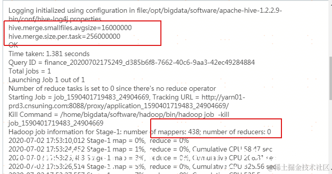 看上去配置的没啥问题,不管是Map-only,还是MapReduce都考虑到了,只要输出的文件小于这个值,就重新启动一个MR去执行文件合并。看也符合Hive官网的配置解释