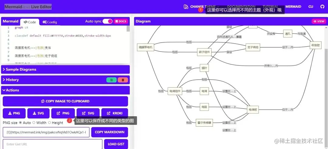 如果你选择不下载任何工具,直接在线画图。那通过Mermaid Live Editor (v8.14.0)可以直接生成图片。生成图片的界面长这样: