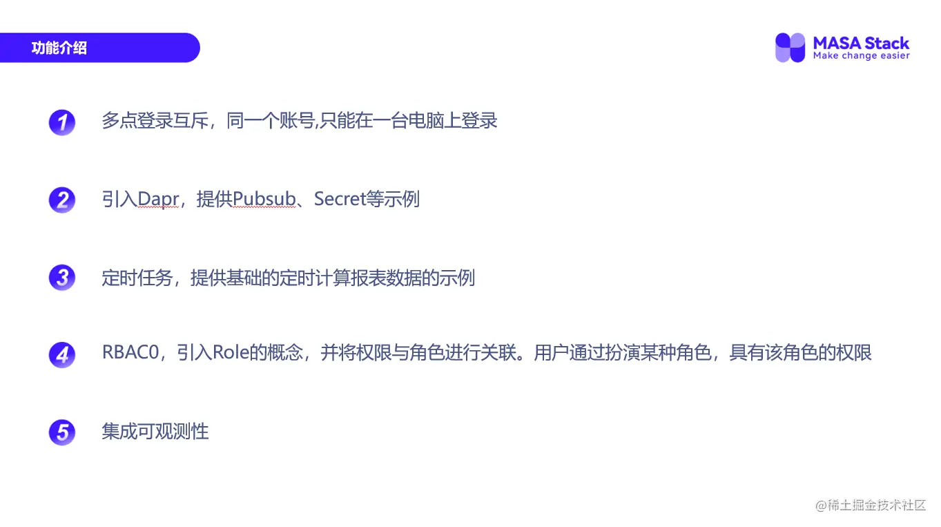 底层框架、后端代码的部分我们用的是MASA Framework,现在看到的是我们第一个版本的功能清单。项目的模板、Dapr Starter...如果你用Dapr,应该就有了解。Dapr D的边车,每次启动的时候,会比较麻烦。所以我们做了一个Dapr Starter,只需要一行代码,它会自动去帮你管理Dapr D的整个生命周期,包括配置、包括端口映射等等一系列的操作,全部都会帮你做好。