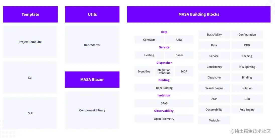 Building Blocks 是我们提供的整个框架的接口标准,就是我们提供了哪些功能,这些功能都是通过接口标准提供的。Contribe就是实现了Building Blocks这些接口的,然后我们提供了一些,我们认为,你在用这些功能的时候,可能默认要用的一些选项。在我们Building Blocks 里面,除了一些数据类相关的、服务类相关的,还有比如说Event Bus,包括隔离性、可观测性等这些都是有的。
