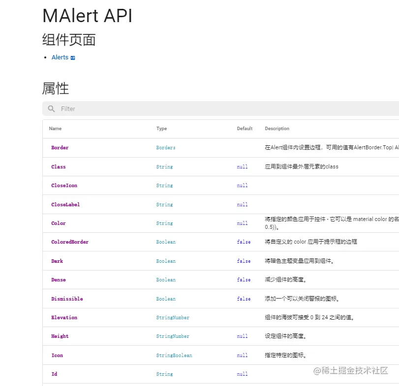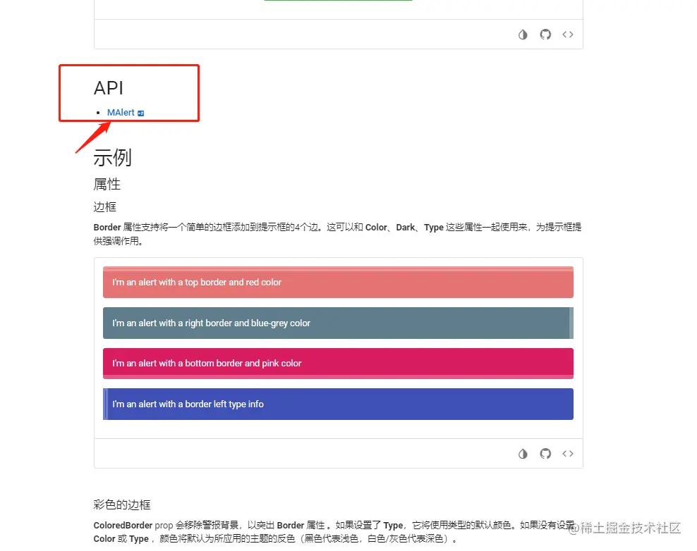 用过我们组件库的小伙伴,反映说”示例少“,这里和大家讲一下原因,因为一个组件的功能很多,我们不太可能,全部都做成示例,如果你想看下,支不支持更多的功能,可以如下图所示,点击API进入之后,就可以看到我们的组件,提供了多少属性、插槽、事件等,用过vue的小伙伴,对插槽这些,应该很熟悉。