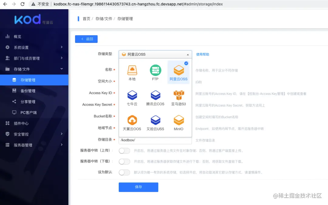 - 使用 admin 账号登录, 进入后台存储管理, 添加适合自己的存储, 比如增加一个 OSS Bucket。