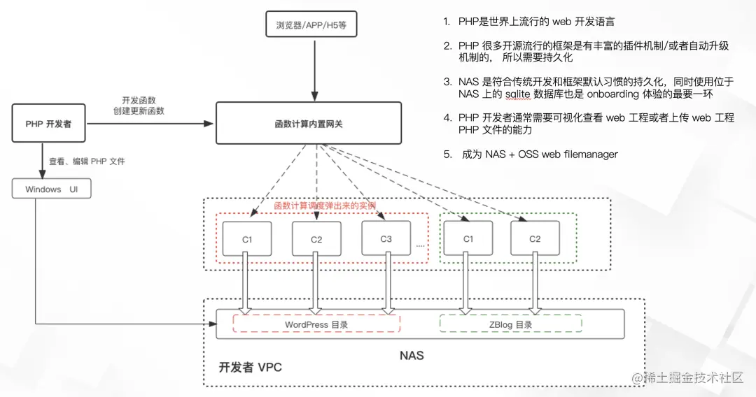 在文章《PHP 遇见 Serverless,帮你解决这些痛点!》中, 我们十分细致地讨论了 PHP 应用在 Serverless 的最佳实践方式以及带来的巨大价值, 其中最重点的一个点是 FC 弹出的实例演化为存粹的执行环境, PHP web 工程存储到 NAS, 这个时候我们就可以使用 Kodbox + FC 实现 windows 体验般的 WEB UI 对 NAS 上的 PHP 工程就行管理, 包括上传、覆盖、删除、修改等。