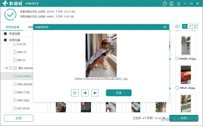 第2步:扫描结束后,我们在其中找到需要恢复的文件,找到文件还可以先预览下,特别是照片文件,很多可以清晰预览,还可以通过切换视图换个视角看文件详细信息等。