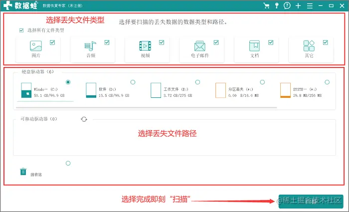 第1步:打开电脑中的数据蛙数据恢复专家(www.shujuwa.net/shujuhuifu/ ),选择丢失的文件类型和选择文件丢失前的存放路径,确认选择无误之后开始“扫描”;