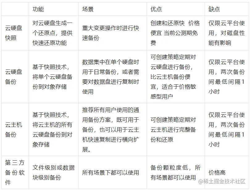 云主机快照、云硬盘备份、云主机备份都是天翼云提供的简单快捷的数据备份方式,只能在云平台上使用。它的缺点是仅限云平台使用,使用策略进行定期备份时间隔最少要相隔一个小时,不能实现连续备份。所以对于数据库等关键系统,建议使用数据库厂商自己的解决方案或者第三方备份软件对数据库做逻辑备份,甚至使用