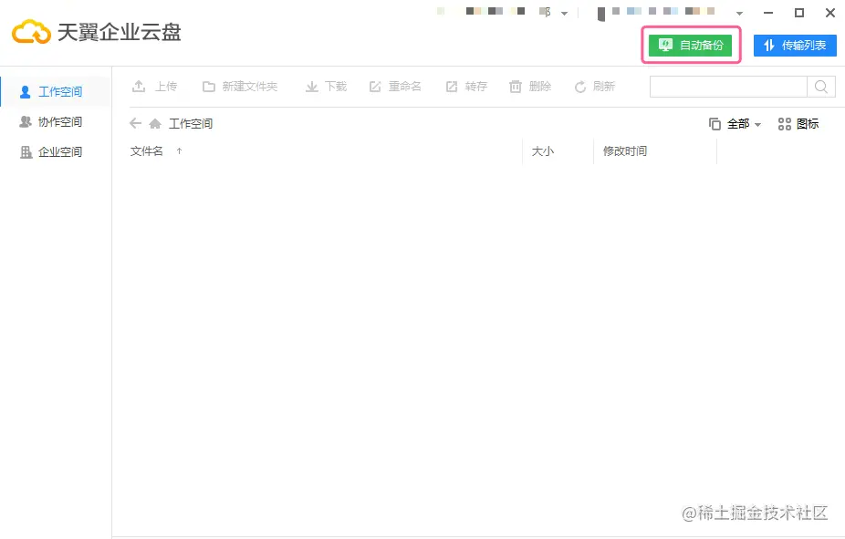 在云主机上安装天翼云盘企业版客户端,以个人账号登录后进入个人空间,点击自动备份。