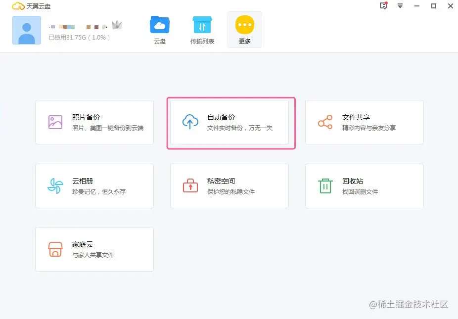 在云主机上安装天翼云盘个人版客户端,登录后点击界面上的“更多“按钮,再点击“自动备份”功能,选择需要备份的目录。