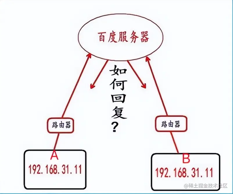 再者,我们大多人都是使用宽带上网,结果发现,A 和 B 的局域网 IP 都是192.168.31.11,当他们都访问百度浏览网页时,百度服务器回复数据时,如何区分是给 A 还是给 B 呢?