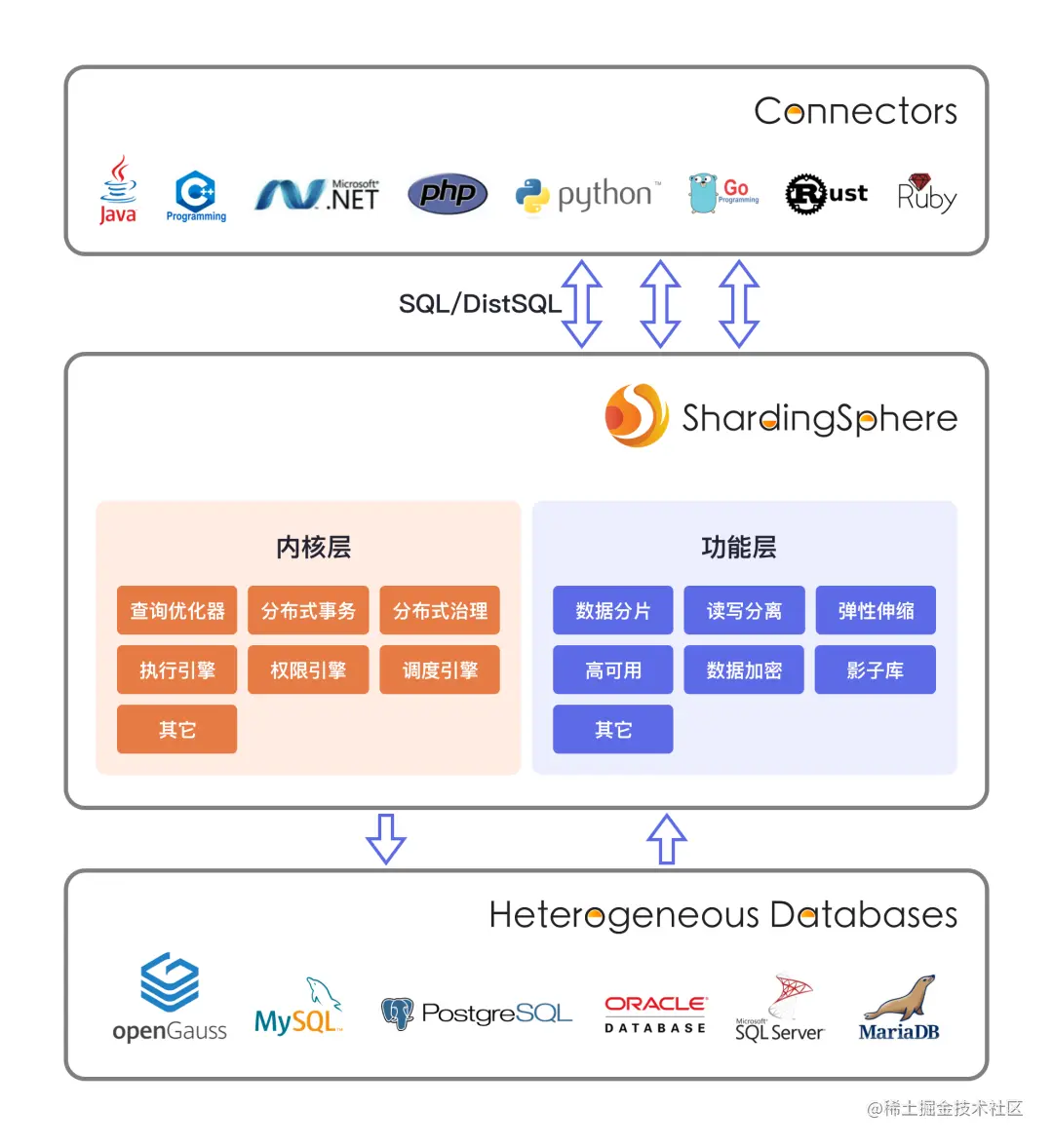 作为 Database Plus 理念的提出者和实践者,Apache ShardingSphere 旨在构建异构数据库上层的标准和生态,以叠加扩展数据分片、弹性伸缩、数据加密等更多计算能力为基础,站在数据库的上层视角来关注数据库之间的协作方式,以能够合理且充分地利用数据库计算与存储能力。目前,Apache ShardingSphere 已经形成了微内核 & 可插拔架构模型,并在此基础上持续完善内核及功能层面的能力,为企业及开发者用户提供更多更灵活的解决方案,以满足在不同场景下的特定需求。