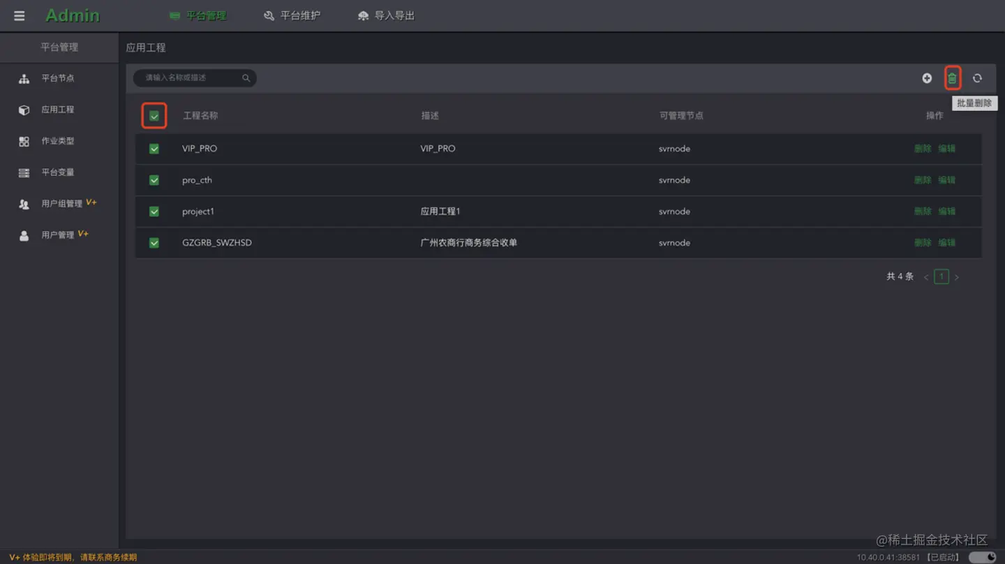 点击列表的**“删除”**按钮,删除当前工程。还可以选择多个工程进行批量删除。删除工程后,通过后台字符界面客户端列举出没有所属工程孤立控制器。