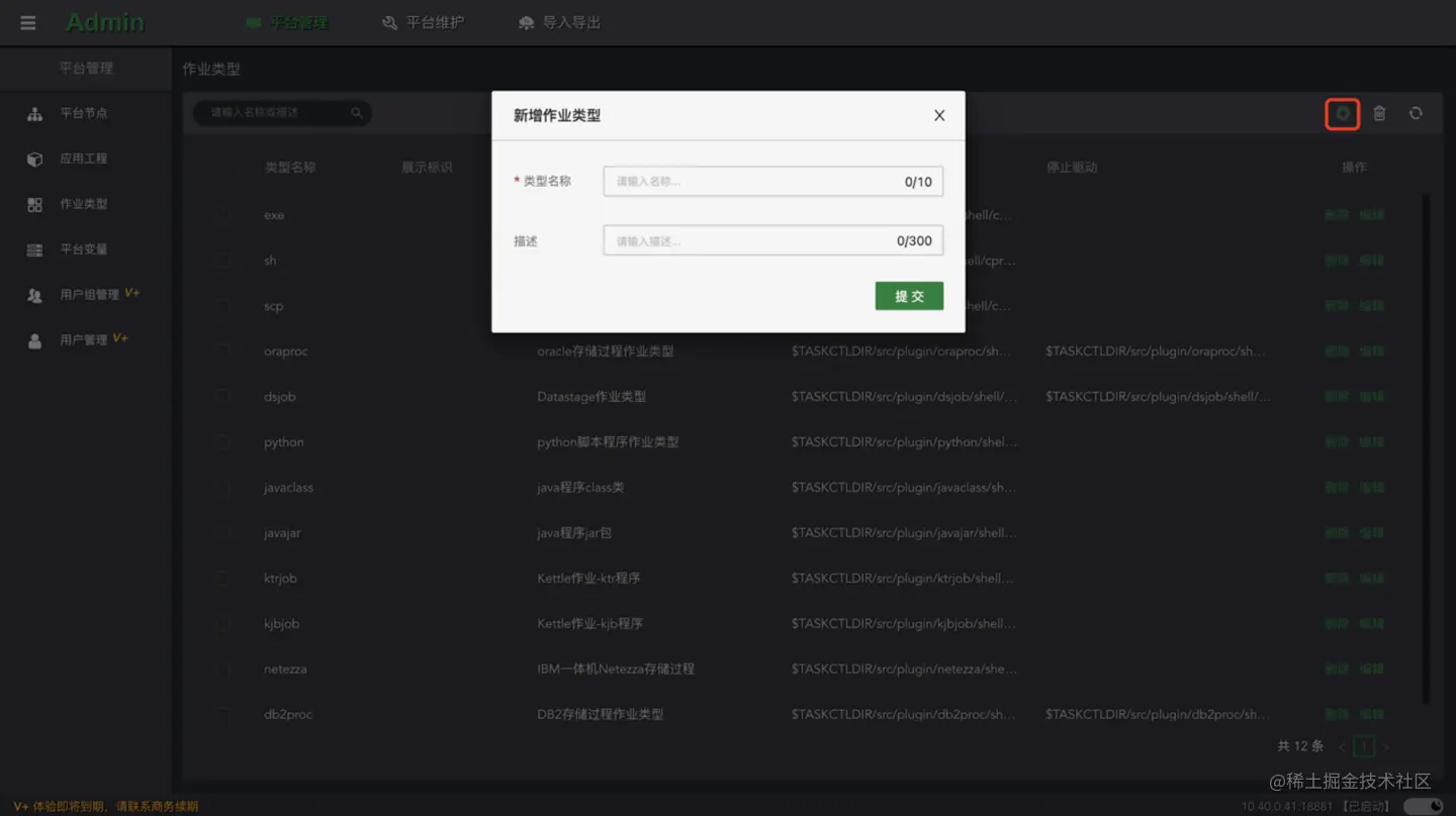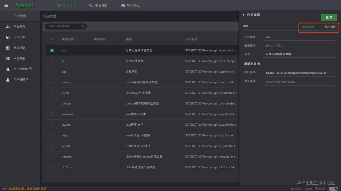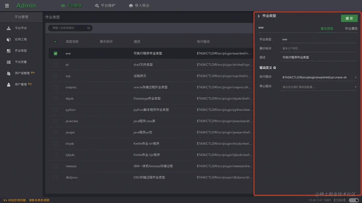 点击列表的**“编辑”按钮,打开当前作业类型的侧边编辑窗口。对基本信息和作业属性配置信息进行修改和配置。点击“提交”**按钮,等待完成即可。