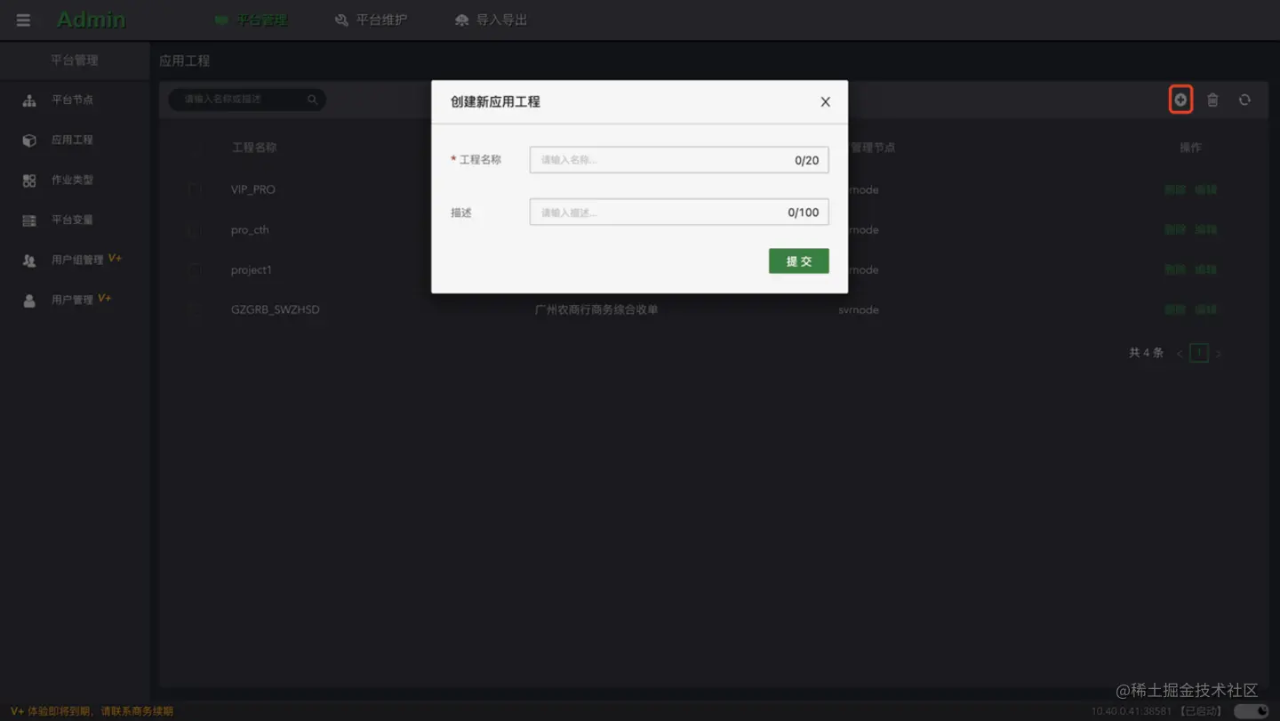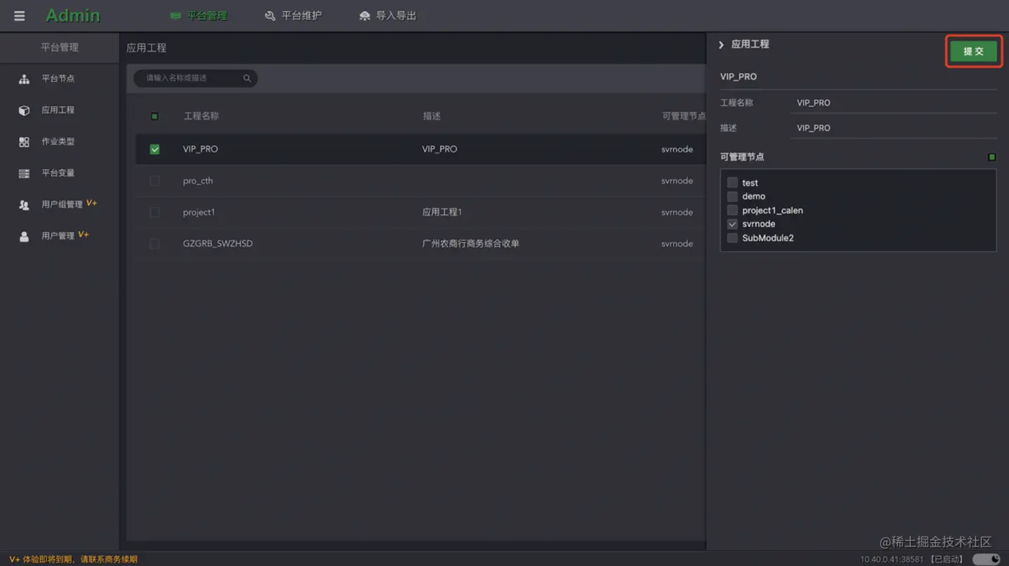 点击列表的**“编辑”按钮,打开当前工程的侧边编辑窗口。对描述信息,和可管理节点的选项进行修改和配置。点击“提交”**按钮,等待完成即可。