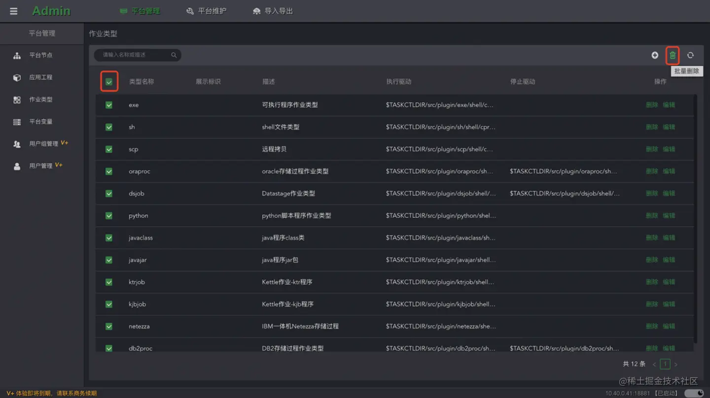 点击列表的**“删除”**按钮,删除当前作业类型。还可以选择多个作业类型进行批量删除。