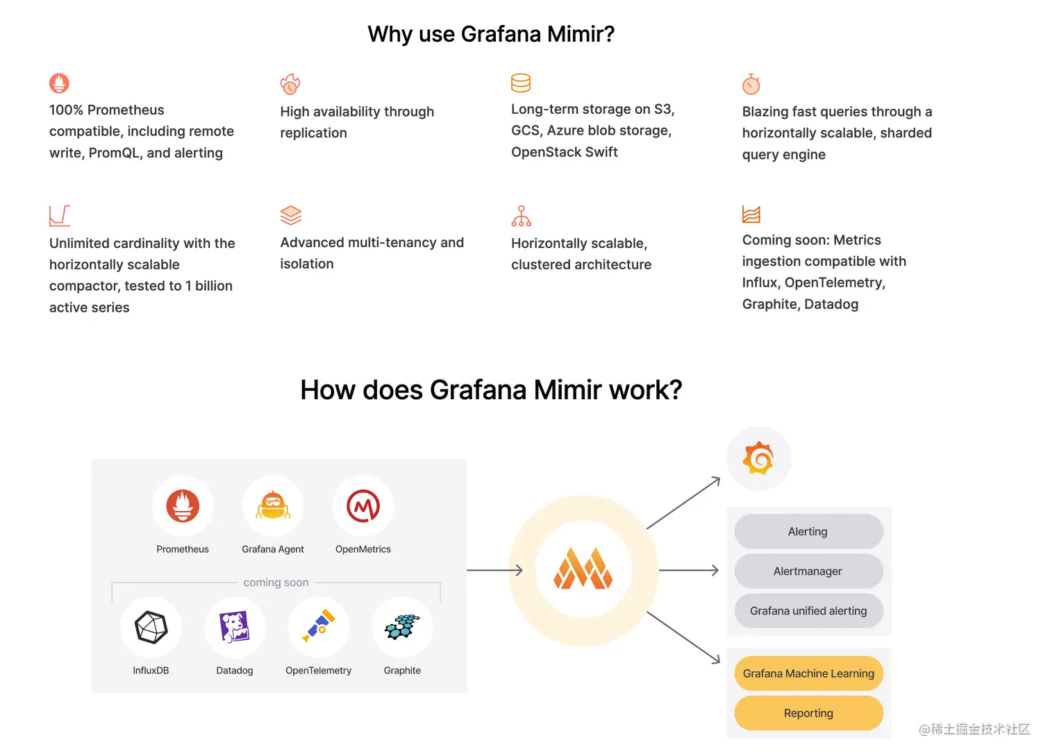 Grafana Mimir 是 Grafana Labs 新开源的项目,用来为 Prometheus 提供持久化存储,开源许可协议是 AGPL-3.0。此前 Grafana 开源了 Cortex,但 Grafana Cloud 使用的还是内部商用的存储,因此 Grafana 团队需要维护两套代码。也许是维护两套代码太累了,所以干脆将 Grafana Cloud 使用的存储开源了,就是 Grafana Mimir。