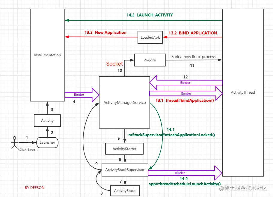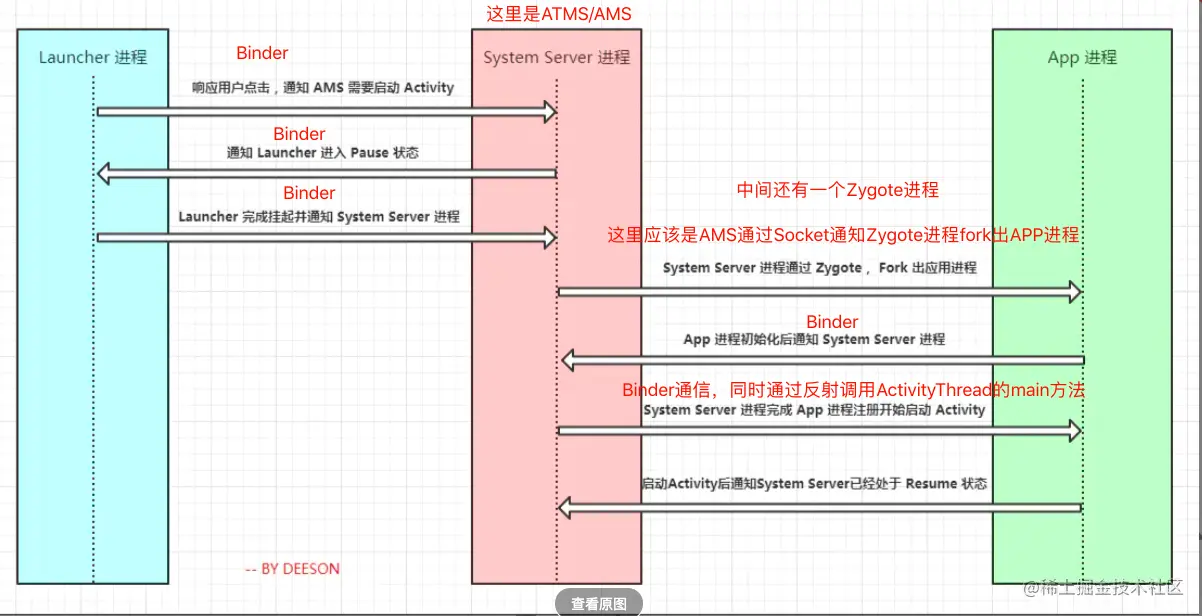 答:APP的启动是从用户点击桌面的icon开始的。Android的桌面应用叫Launcher,可以把桌面也看作是Android系统的一个应用,桌面只是这个应用的其中一个页面而已。Android中每个应用就是一个进程,那一个应用启动另一个应用并通信,肯定会有进程间通信,也就是IPC通信,在Android中的IPC大部分都是通过Binder实现的。这样分析的话,APP启动流程其实就是Activity的启动流程,只不过中间会有判断要启动Activity所在的进程是否存在,如果不存在则先通知Zygote进程fork()一个新的进程,然后启动目标页面。如果要只看总结,翻到最后面,总结了七个点: