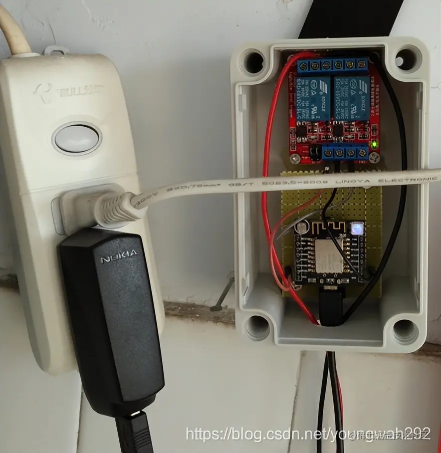 **步骤⑦:**给ESP8266供电的是USB接口的充电器,现在家里往往都有好几个闲置的充电器可以用,充电器也是一个专门的学问,大厂的充电器质量还是杠杠滴,用在这里非常合适(省电、可靠),比自己做一个简单的220转5伏电路可靠多了。