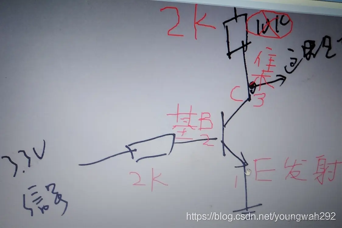 **步骤②:**准备3.3伏转5伏电路。因为ESP8266输出的IO电平是3.3伏,而手头的继电器是5伏才能控制,所以需要加一个电平转换,或者叫做开关电路,使用的是NPN三极管S8050,原理如下图。