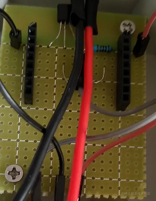 **步骤③:**用洞洞板固定单排母(用来插入ESP8266模块)和三极管电路,给ESP8266供电(5伏),并将GPIO12连接至三极管电路的基极电阻上。洞洞板打3毫米孔,用来固定在壳体上。