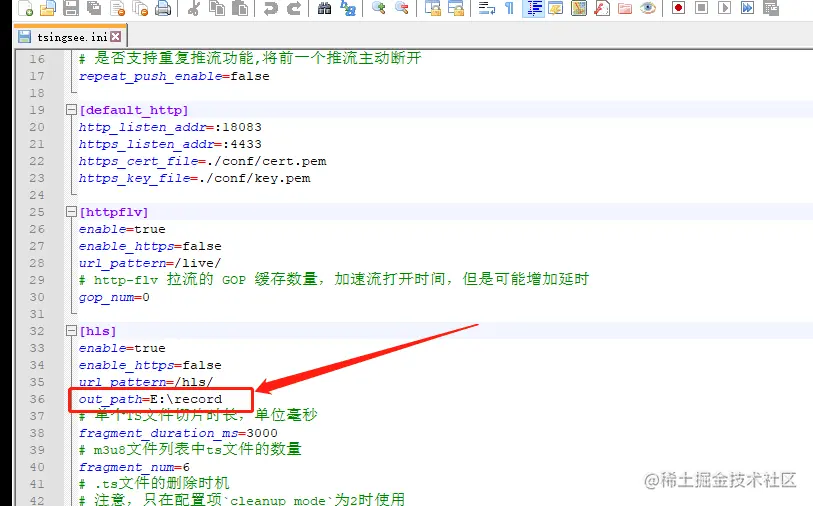 2)创建完成后,我们打开EasyNVR目录下的mediaserver-tsingsee.ini配置文件,在里面找到hls这一行,将out_path的参数修改为新磁盘下方创建的目录,如下图所示(绝对路径):