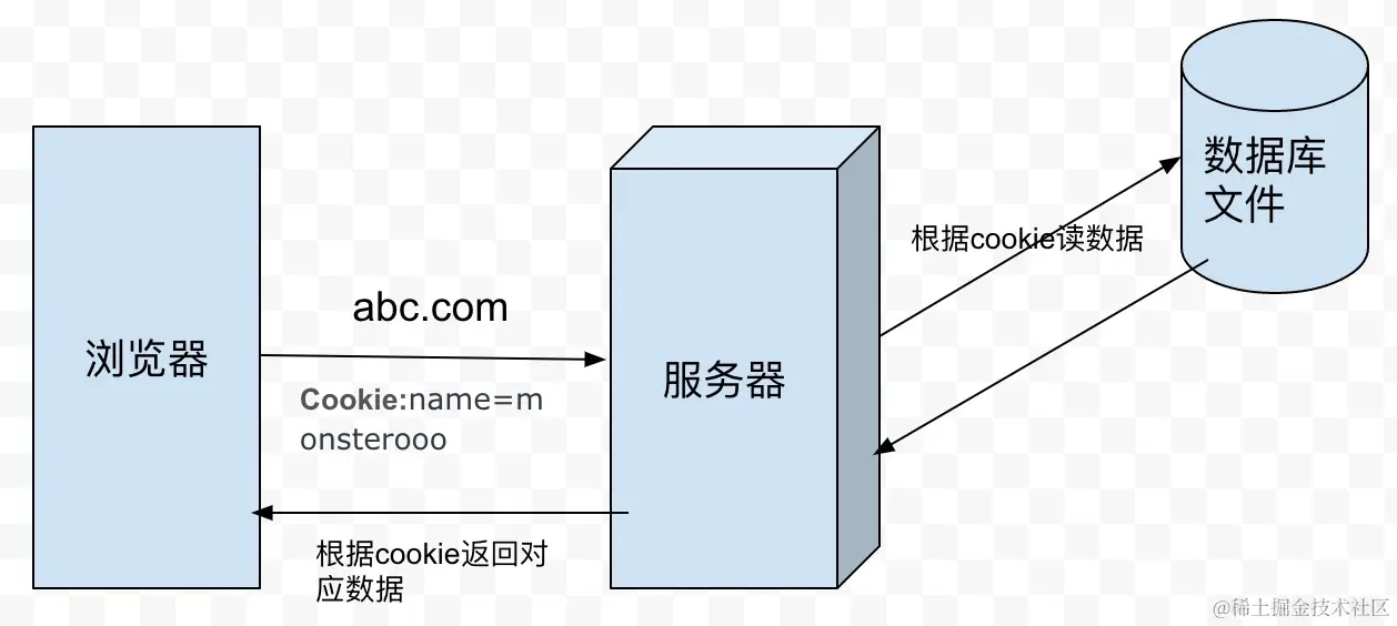 浏览器在本地按照一定规则存储一些文本字符串,每当浏览器像服务器发送请求时带这些字符串。服务器根据字符串判定浏览器的状态比如:登录、订单、皮肤。服务器就可以根据不同的cookie识别出不同的用户信息。浏览器和服务器cookie交互图如下。