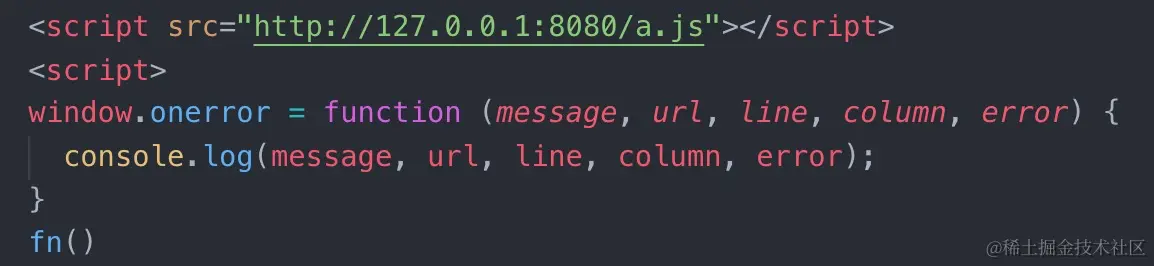 其中并没有 fn1 这个方法,所以将触发 onerror 事件,将 message 打印出来,我们将看到如下信息