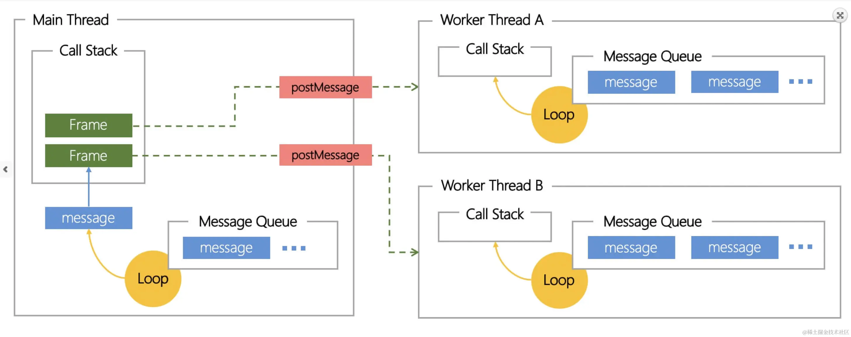 渲染进程负责所有发生在浏览器页签中的事情。在一个渲染进程中,主线程负责解析,编译或运行代码等工作,当我们使用 Worker 时,Worker 线程会负责运行一部分代码。合成线程和光栅线程是也是运行在渲染进程中的,负责更高效和顺畅的渲染页面。