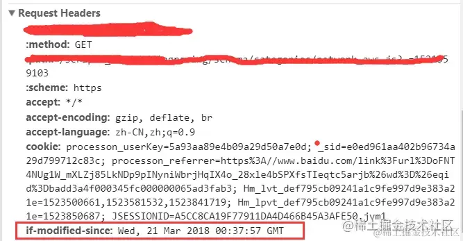 If-Modified-Since则是客户端再次发起该请求时,携带上次请求返回的Last-Modified值,通过此字段值告诉服务器该资源上次请求返回的最后被修改时间。服务器收到该请求,发现请求头含有If-Modified-Since字段,则会根据If-Modified-Since的字段值与该资源在服务器的最后被修改时间做对比,若服务器的资源最后被修改时间大于If-Modified-Since的字段值,则重新返回资源,状态码为200;否则则返回304,代表资源无更新,可继续使用缓存文件,如下。