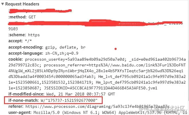 If-None-Match是客户端再次发起该请求时,携带上次请求返回的唯一标识Etag值,通过此字段值告诉服务器该资源上次请求返回的唯一标识值。服务器收到该请求后,发现该请求头中含有If-None-Match,则会根据If-None-Match的字段值与该资源在服务器的Etag值做对比,一致则返回304,代表资源无更新,继续使用缓存文件;不一致则重新返回资源文件,状态码为200,如下。