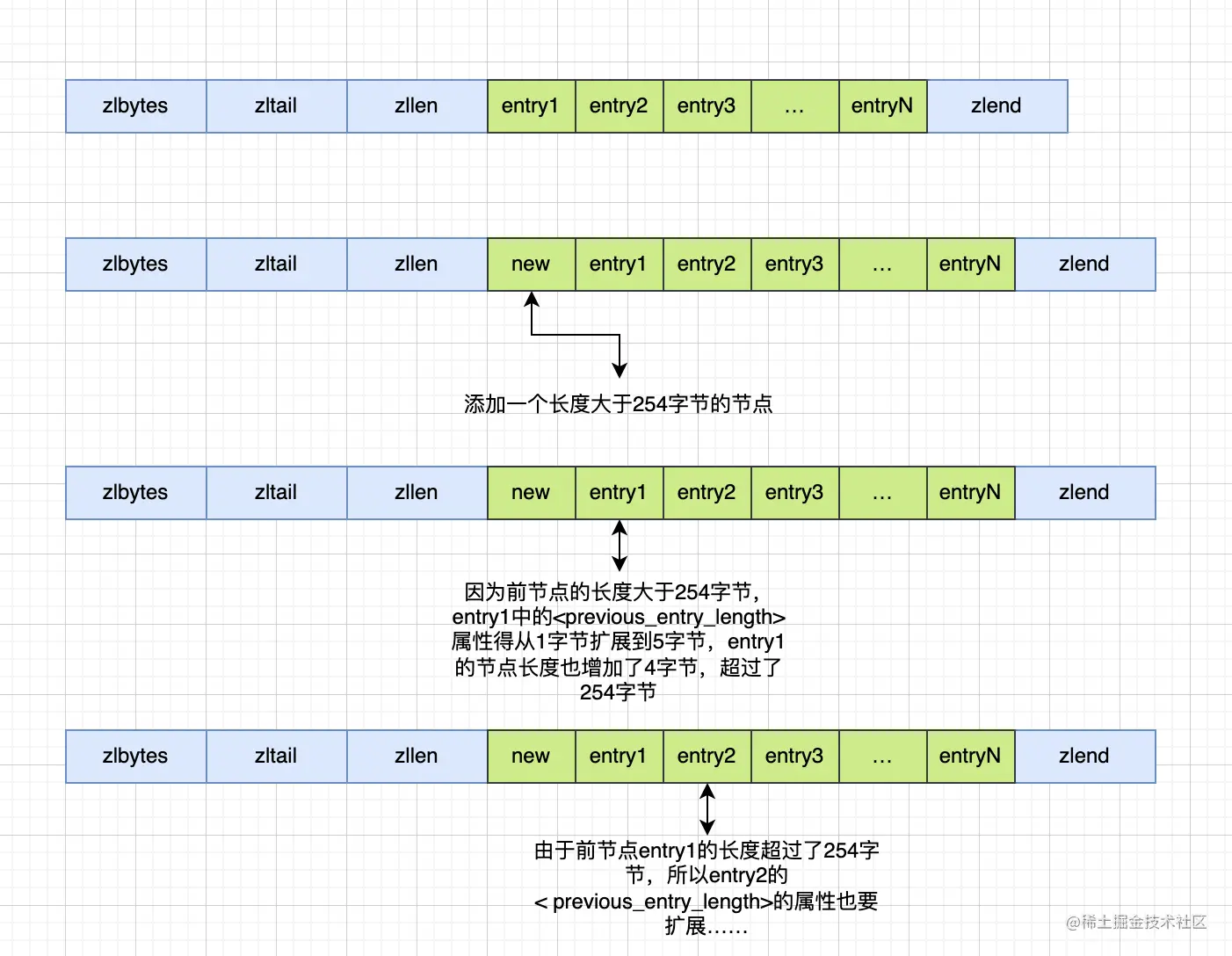 - entry的last节点:因为内存连续,又知道 previous_entry_length 属性值,即前一节点的长度,所以可以得到上一个节点的起始位置。