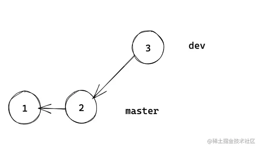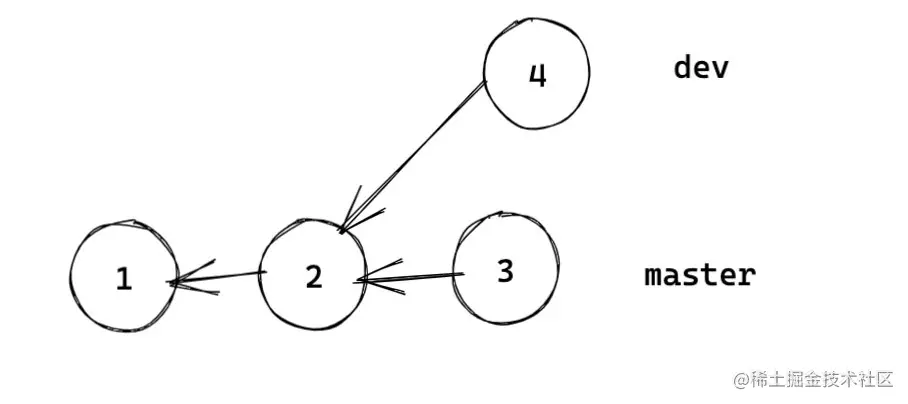 如上图,我们基于提交 2 创建了新分支 dev,dev 上开发后我们可以将其合并到主分支 master。