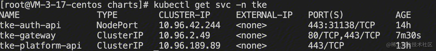 会在同级目录生成 auth-chart-values.yaml、platform-chart-values.yaml、gateway-chart-values.yaml 三个 yaml 文件,分别对应三个 chart(tke-auth、tke-platform、tke-gateway)在安装时需要的 values.yaml 文件。