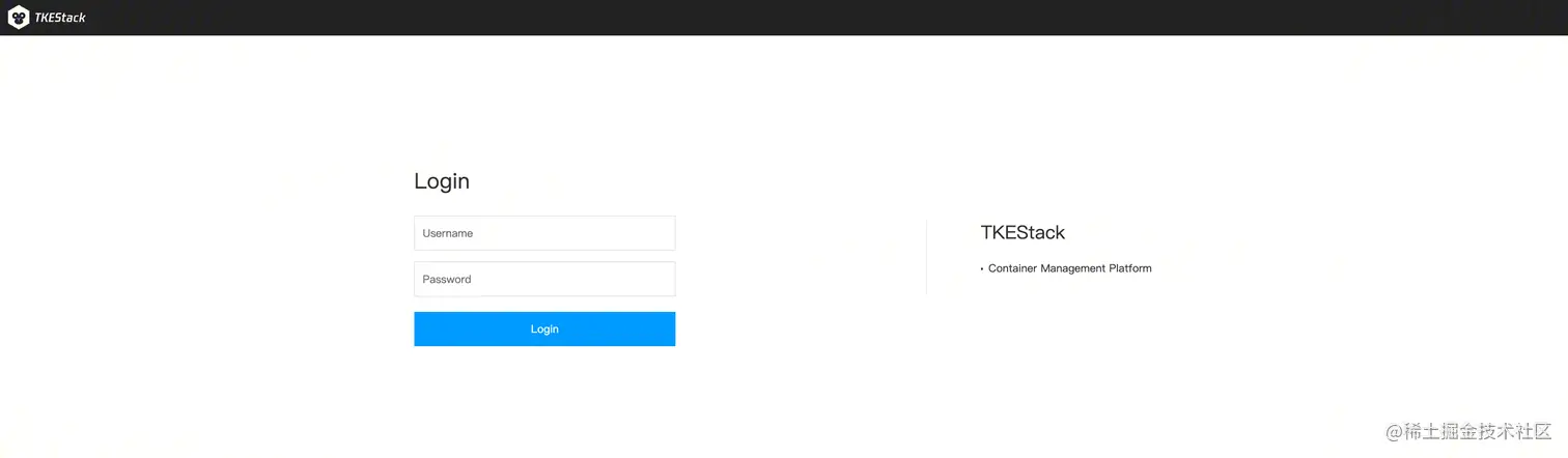 访问地址 http://{公网可访问ip}/tkestack,出现如下登陆界面,输入之前设置的用户名 adminUsername 和密码 adminPassword,如无设置,默认用户名为 admin ,密码为 YWRtaW4=。