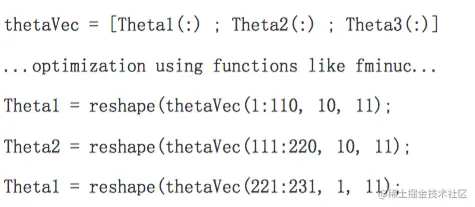 在Octave或者Matlab中,如果我们使用 fminuc 这样的优化算法求解求出权重矩阵,我们需要将矩阵首先展开为向量,再利用算法求出最优解后再重新转换回矩阵。