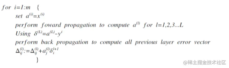 如果我们考虑归一化处理,并且我们的训练集是一个特征矩阵而非向量。在上面的特殊情况中,我们需要计算每一层的误差单元来计算代价函数的偏导数。在更为一般的情况中,我们同样需要计算每一层的误差单元,但是我们需要为整个训练集计算误差单元,此时的误差单元也是一个矩阵,我们用来表示这个误差矩阵。第 l 层的第 i 个激活单元收到第 j 个参数影响而导致的误差。