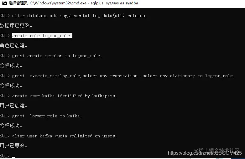 c.为了成功执行连接器,必须使用特权Oracle用户启动连接器。 如果给定的用户具有DBA角色,则可以跳过此步骤。否则,需要执行以下脚本来创建特权用户: