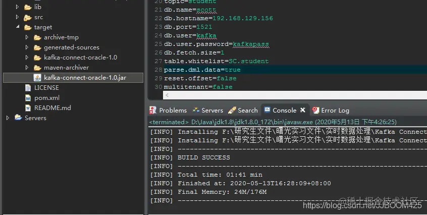 B.产生jar包:kafka-connect-oracle-1.0.jar 和lib中的ojdbc7.jar 复制到KAFKA_HOME / lib文件夹中。