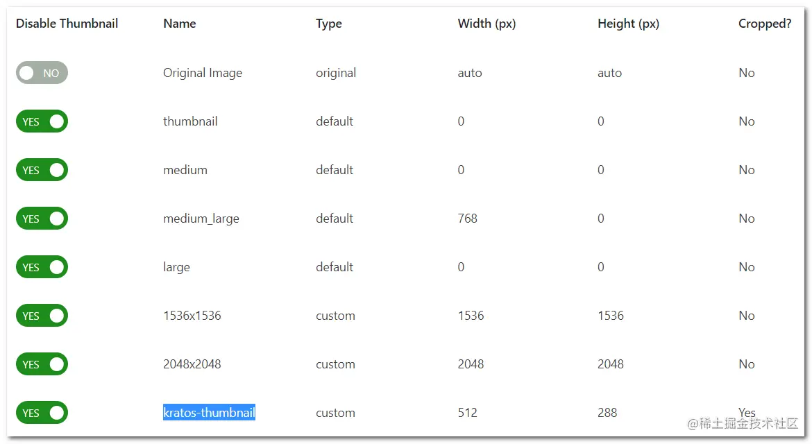 4、使用/image-sizes/插件检查,判断512x288缩略图属于“kratos-thumbnail”生成,说明插件无法禁止这部分缩略图: