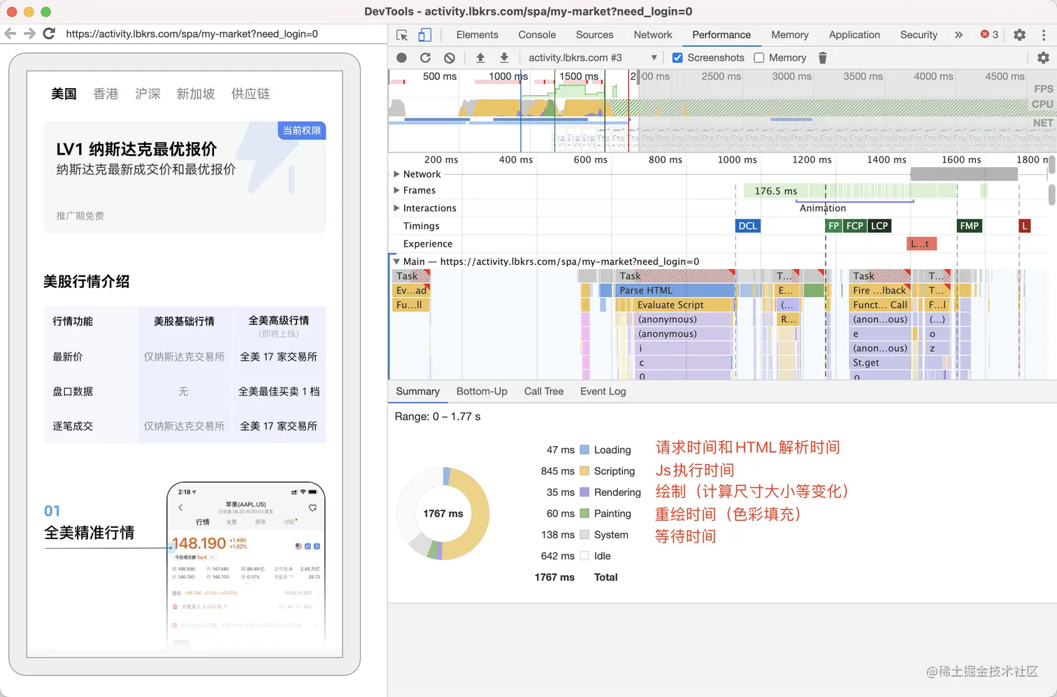 | html 解析 | 约300ms~500ms | Performance 里面 Finish Loading 的值是 0 ,可能这段时间包含了下载的耗时 |