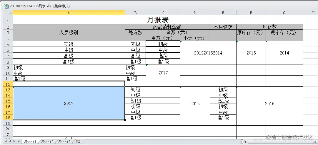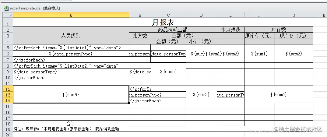 <dependency> <groupId>net.sf.jxls</groupId> <artifactId>jxls-core</artifactId> <version>1.0.6</version> </dependency> 后者也已经停止维护,最新的包是2014年的,不过相对于来说我更喜欢用后者,更方便, 相对于前者不用配置作用域,包括循环等.前者是用注释的方式实现,我尝试使用的时候 发现行中间的合并其不能做到(也许是我用的不对,总之就那样了),但是直接用代码操作 合并单元格又过于繁琐,这也是当前开发的背景. 同事使用时候遇到合并单元格的问题,合并的单元格不能解析数据也不能正确的合并 如我下图的模板,合并了3行则生成出来的excel也只合并了3行,并且根据循环的数据量 往下错位若干格,而且少一个边框,究其原因,原作者根本没处理循环内的合并单元格问题 ,故此对1.0.6做了开发,修复这个问题,并将版本命名为2.0.传递到maven私服,pom为 <dependency> <groupId>net.sf.jxls</groupId> <artifactId>jxls-core</artifactId> <version>2.0</version> </dependency> -