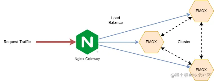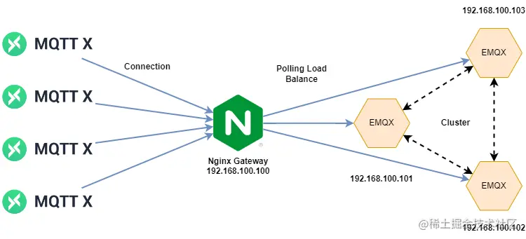 本节我们选择用 Nginx 来作为 EMQX 集群的网关,最终搭建的效果如下所示,