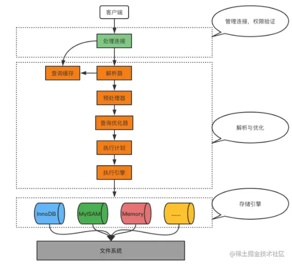 服务器收到客户端传来的请求之后,还需要经过查询缓存、词法语法解析和预处理、查询优化的处理。