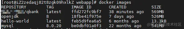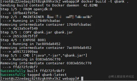 其中参数 -t [镜像名] [Dockerfile所在路径],这里镜像名为qbank, 路径为当前目录