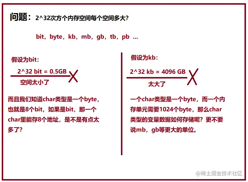 那一个内存单元多大才合适呢,这里我们有bit,byte,kb,mb,gb,tb等供您选择,我们先试试最小的bit合不合适,2的32次方bit化为gb就是0.5gb,一共大小才0.5gb,不合适吧。经过仔细的计算和权衡我们发现一个字节(byte)给一个对应的地址是比较合适的!