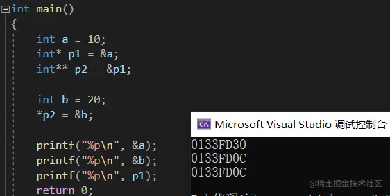 这里就是说明其实三级指针也是可以二次解引用,访问a的地址,然后去操作a地址上的内容,这里**p2也可以想象成*(*p2),*p2就是访问p1,所以化为*p1,而*p1访问的就是a的地址。 所以最终结果是30.