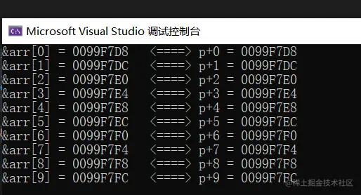 printf("&arr[%d] = %p <====> p+%d = %p\n", i, &arr[i], i, p + i);