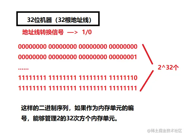 我们知道,机器有32位的,也有64位的。那32位的机器有32根地址线,然后通电后的高电频低电频由电信号转化为数字信号,这个数字信号就是1或者0,而32根地址线产生32个1/0。